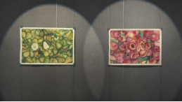 再往里走像拆盲盒,一幅水彩画率先撞入视野,满纸的黄梨绿梨坠在枝叶间,圆润的果身泛着淡淡的红晕,连叶片的脉络都透着鲜活的生机;旁边的红桃图更显精妙,饱满的桃子裹着鲜亮的红,有的被轻轻剥开,露出嫩白的果肉和浅褐的桃仁,果香仿佛要透过画纸漫出来。每一笔晕染的细腻,每一处色彩的铺陈,都藏着创作者俯身观察果木时的专注,是把枝头鲜果的清甜与鲜活,尽数揉进颜料里的用心。