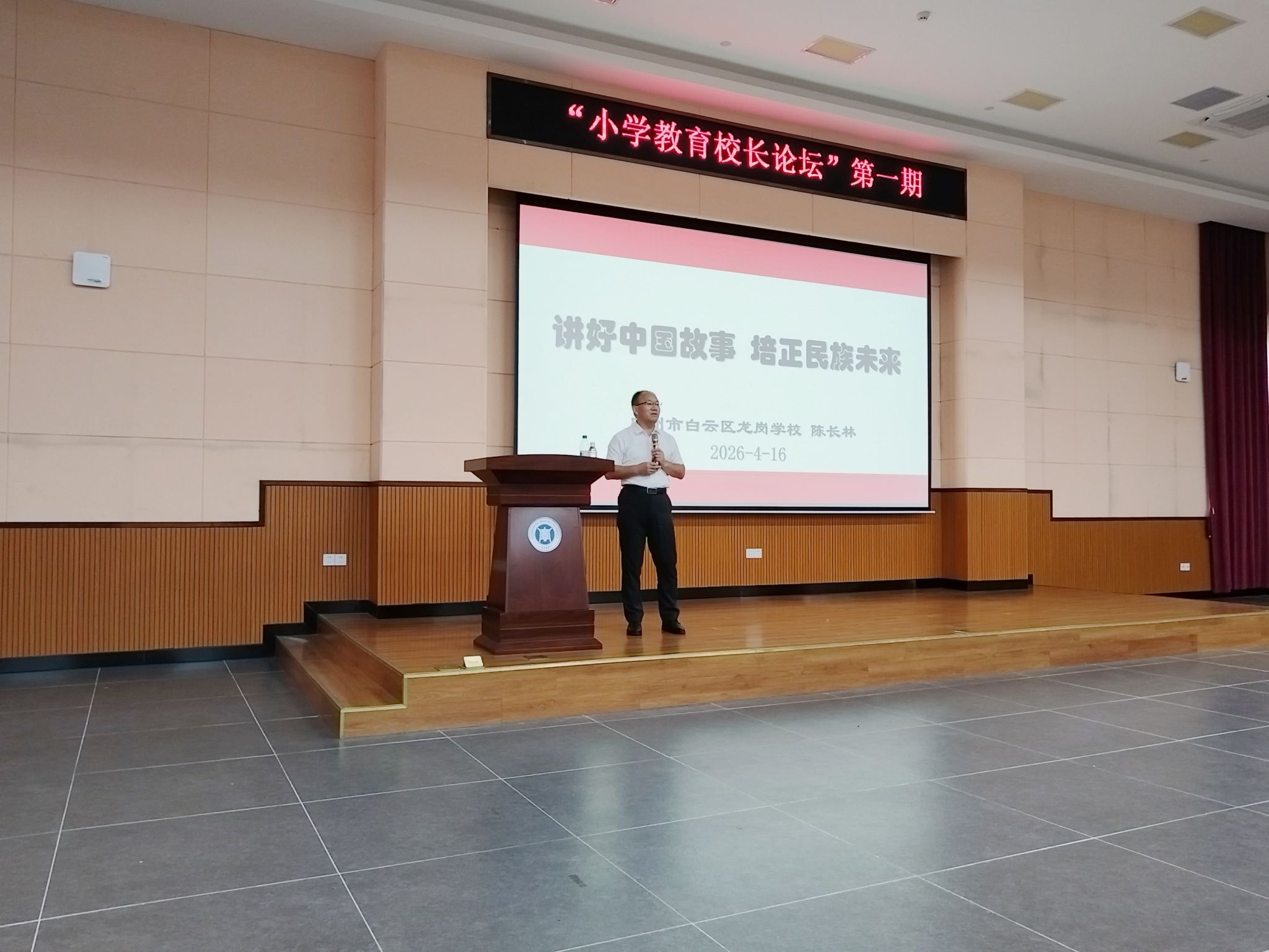 2026年4月16日下午,教育学院小学教育系“小学教育校长论坛”第一期专题讲座在致用楼222室顺利举行。本次讲座以“讲好中国故事,培育民族未来”为主题,特邀广州市白云区龙岗学校党委委员、副校长陈长林主讲,小学教育系主任李亚玲教授及24级小学教育师生参加活动。