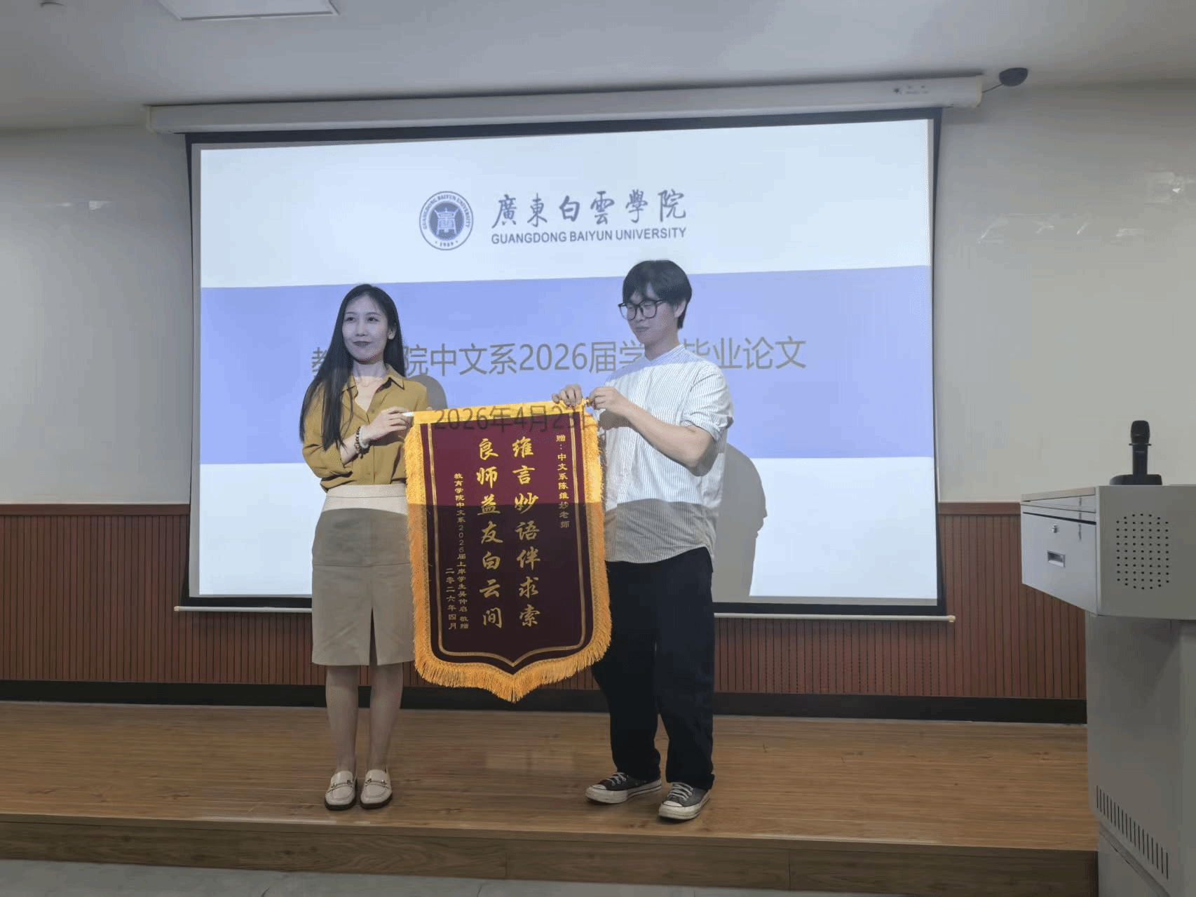 4月23日下午,在明德楼603教室,中文系举办了一场别开生面的首届毕业生论文答辩会。14位学子依次登台,自述论文研究成果并从容应对答辩质询。现场不仅有企业导师王旭东先生、人事处处长程明学、中文系专业负责人阎开振等专家教授坐镇评审,更上演了感人的一幕插曲:22级毕业生吴仲启向中文系及导师敬献锦旗,为这场充满学术仪式感与人文温度的答辩会画上了圆满句号。