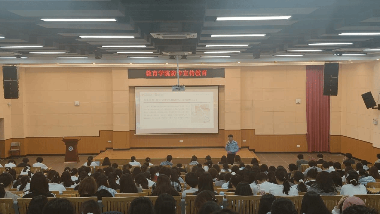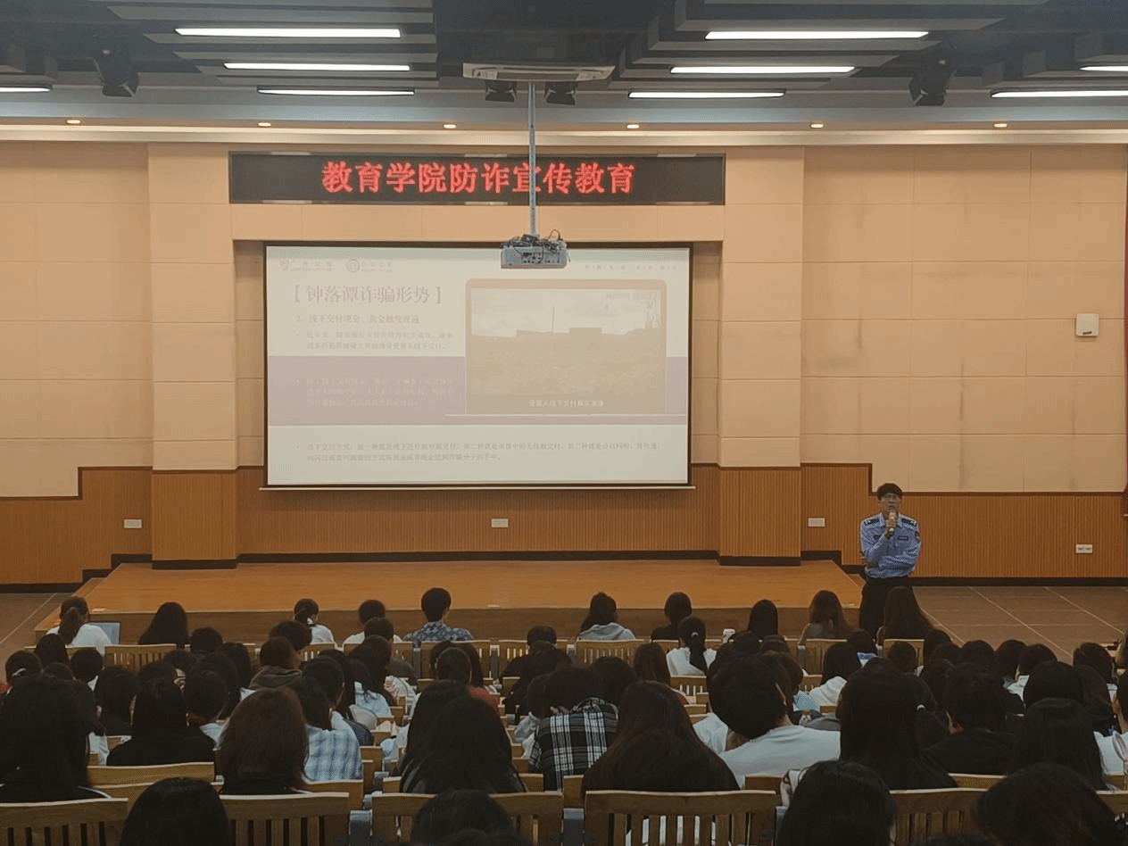 为筑牢校园反诈防线,切实提升学生安全防范意识,4月23日下午,教育学院在致用楼222召开防诈骗安全教育专题宣讲会。学院党委副书记李志华出席活动,2024级、2025级全体宿舍长等近350人参会。宣讲会特邀钟落潭派出所杨警官主讲。